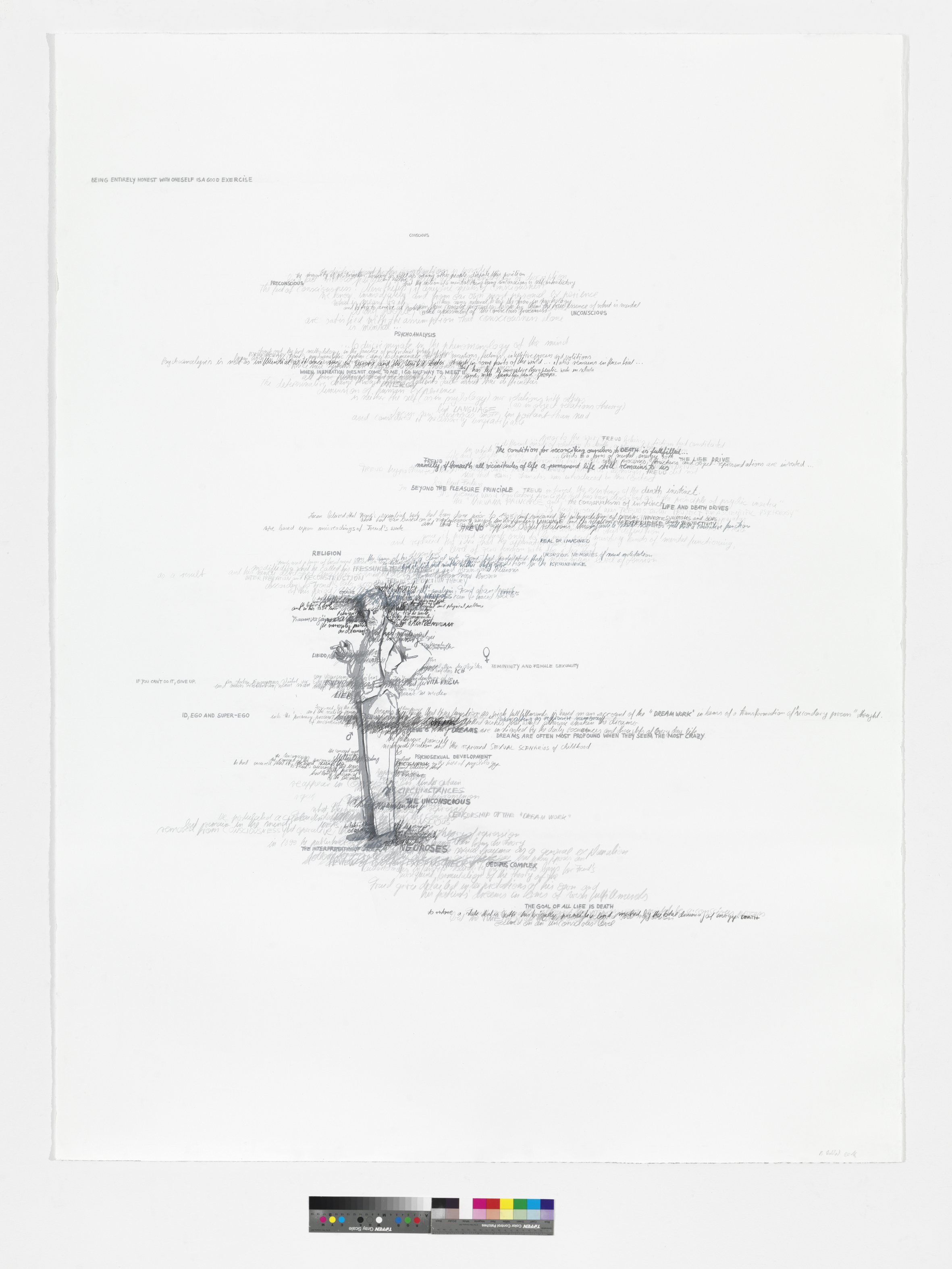 Begriffe, Namen und Schlagworte verdichten sich zu einem Geflecht aus Worten, Linien und figürlichen Schatten, das wie ein gedanklicher Resonanzraum funktioniert. Figuren aus Religion, Politik, Philosophie und Terror tauchen nur schemenhaft auf – nicht um repräsentative Porträts zu liefern, sondern um ihre Sichtbarkeit und narrative Macht zu hinterfragen. In welchem Moment wird etwas zur „Geschichte“? Wer schreibt, wer überschreibt, und welche Stimmen bleiben im Dunkeln? Waldach übersetzt diese Fragen in eine Bildsprache, in der Text nicht erläutert, sondern Struktur wird.