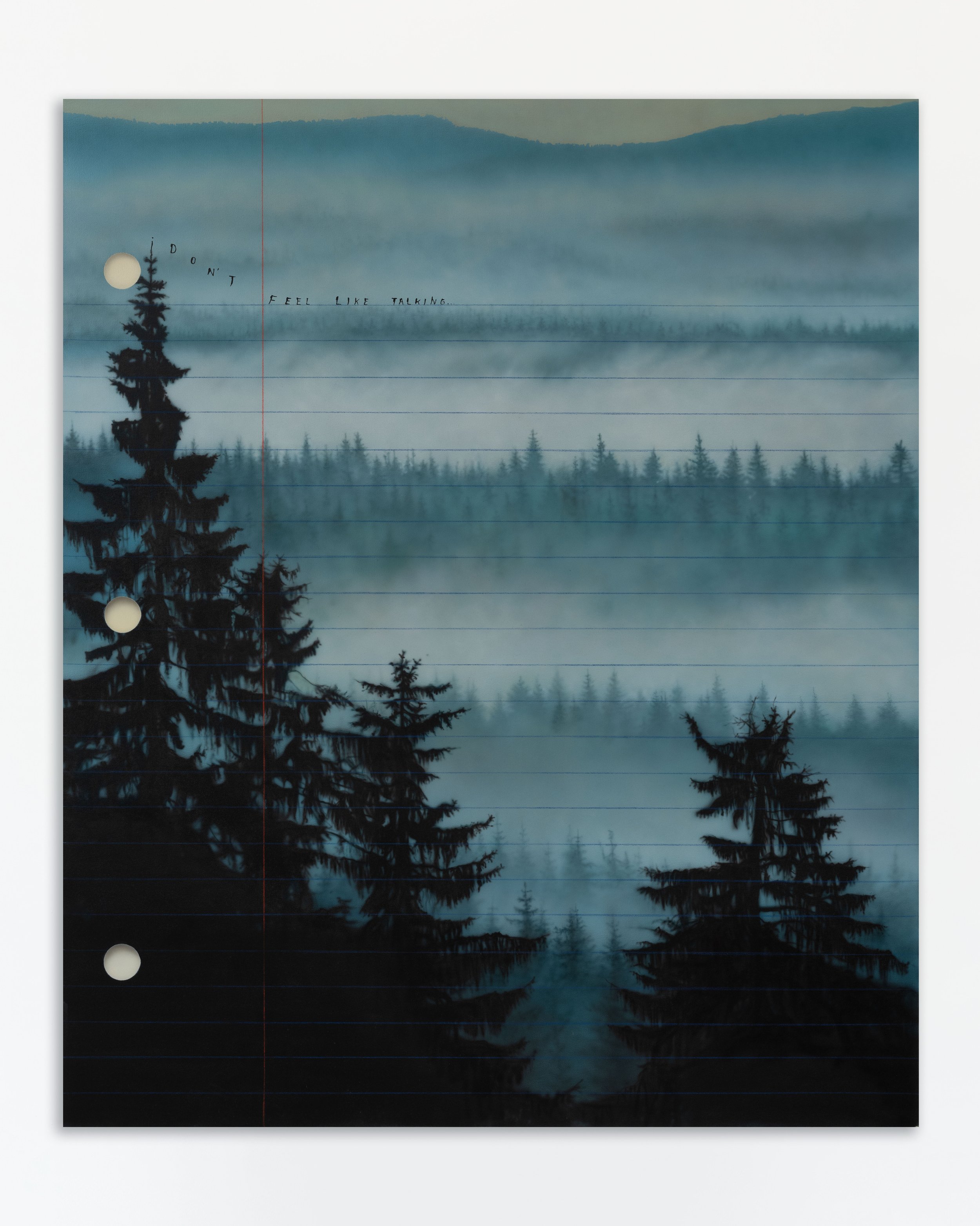 In I Don’t Feel Like Talking malt Kunath eine dichte, nebelverhangene Waldlandschaft, die an romantische Naturvorstellungen erinnert. Doch sie liegt nicht auf Leinwand, sondern auf einem überdimensionierten, linierten Notizblatt – komplett mit Lochrand. Über den Baumwipfeln steht in kleiner Handschrift: „I don’t feel like talking.“ Die monumentale Landschaft trifft auf eine beiläufige Müdigkeit, fast wie ein persönliches Geständnis.