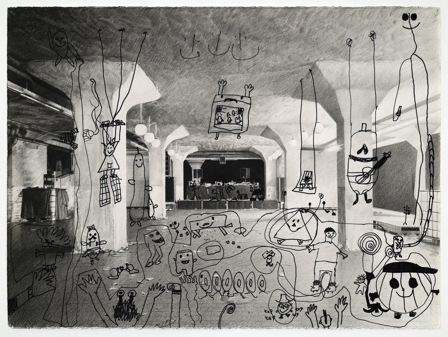 Doch der radikale Bruch entsteht erst durch die Übermalung seiner sechsjährigen Tochter. Mit bunten Strichen, Figuren, Ornamenten und ungebändigter Fantasie belebt sie diese erstarrten Räume, als würden Kinderprojektionen die verlorene Gemeinschaft ersetzen. Was in der Realität verboten war – tanzen, zusammen sein, laut und körperlich sein – findet im kindlichen Spiel plötzlich wieder statt. Die Clubs werden zu Bühnen ihres freien Erfindens, zu Orten, an denen niemand Regeln festlegt.