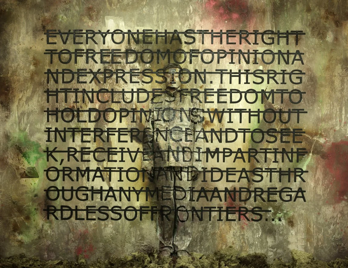 In Hide in Paris n°8 verbindet sich Liu Bolins ikonische Strategie der Unsichtbarmachung mit Reros konzeptueller Sprache der durchgestrichenen Worte. Der Körper des Künstlers verschmilzt mit der Wand, bis er kaum noch vom Hintergrund zu unterscheiden ist. Gleichzeitig legt Rero mit einem typografischen Eingriff einen Satz offen, der nicht der Tarnung, sondern der Sichtbarkeit dient: Artikel 19 der Allgemeinen Erklärung der Menschenrechte, das Recht auf freie Meinung und freie Meinungsäußerung.