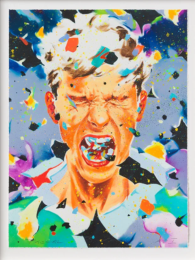 Der offene Mund scheint Farbe förmlich nach außen zu schleudern. Bisky lässt die Figur in einem Strudel aus Farbsplittern, Partikeln und fragmentierten Formen explodieren. Die Komposition vermittelt das Gefühl, dass die Figur nicht nur von Farbe umgeben ist, sondern selbst auseinanderbricht und sich gleichzeitig neu zusammensetzt – ein Zustand zwischen Überlastung, Ausdruckswillen und Befreiung.