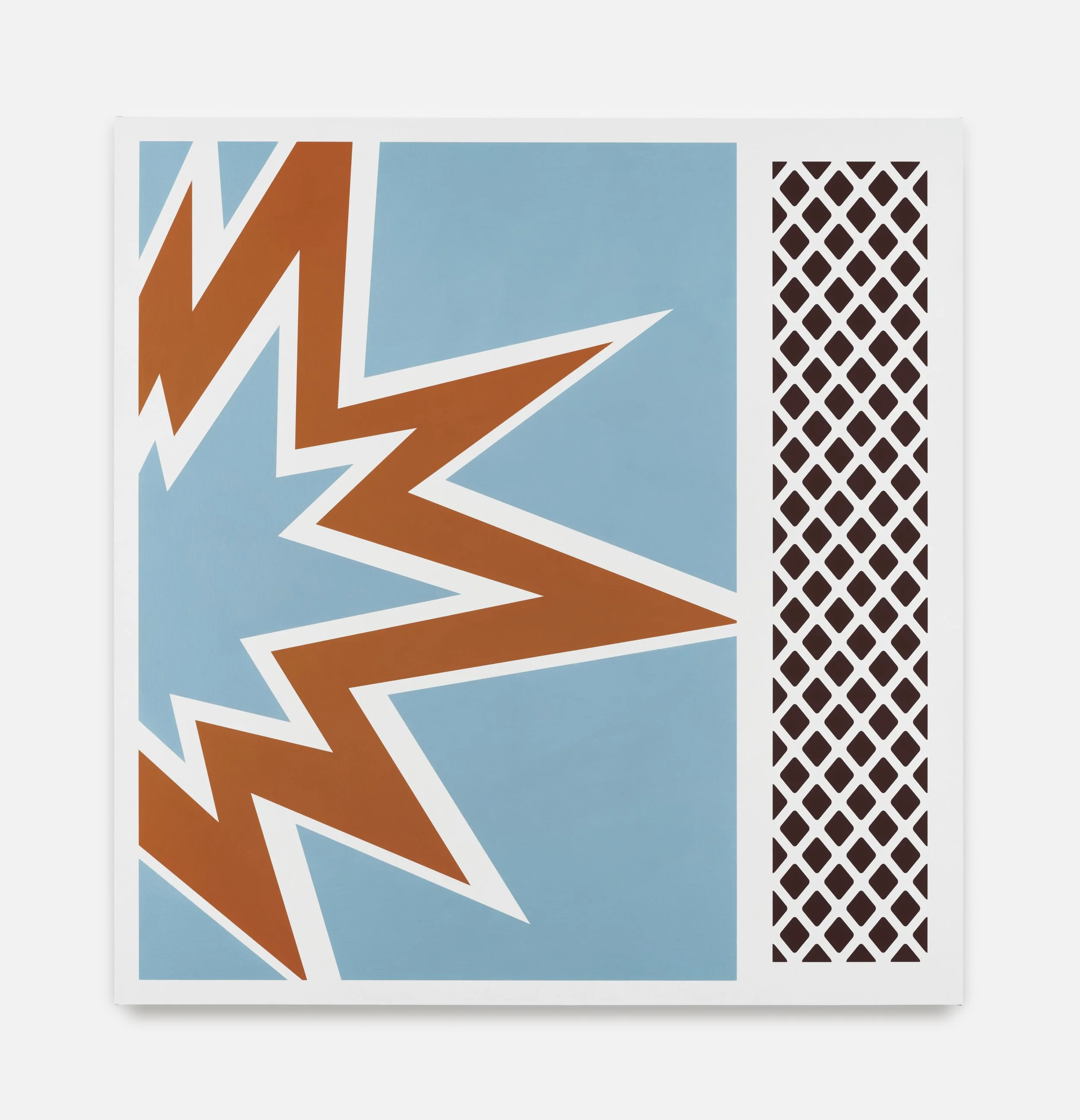 In Starlight schlägt dieses Interesse in eine konzentrierte, fast plakative Form um: Der gezackte Blitzkörper wirkt wie ein herausvergrößertes Detail von Warnhinweis, Comic-Soundeffekt oder Matchbox-Design. Das türkisfarbene Feld lässt ihn förmlich aufleuchten, während der seitliche Streifen mit seinem dichten Rautenmuster an die Reibfläche einer Streichholzschachtel erinnert – eine Struktur, die funktional für Zündung steht und hier zum reinen Bildrhythmus wird.